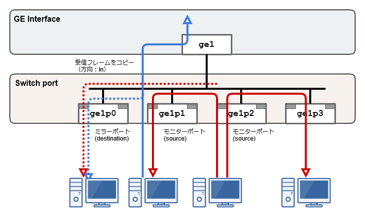 ここでは、ge1p0 をミラーポートとし、ge1p1 および ge1p2 をモニターポートとします。また、モニターポートの受信フレームをミラーポートへコピーする設定を紹介します。
