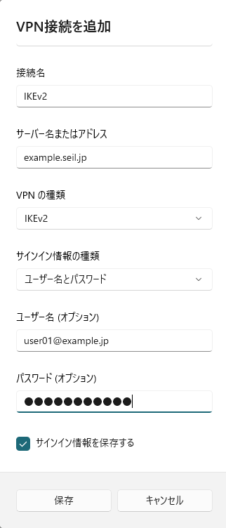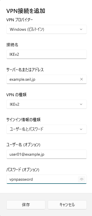 項目 値(例) 備考 リモートアクセスサーバのホスト名 example.seil.jp サーバ証明書のCommon Nameと同一のFQDNまたはIPアドレスであること ユーザー名 user01@example.jp パスワード vpnpassword - VPN設定画面を開く